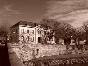 Deux religions : catholicisme et protestantisme. Deux lieux de culte : l’église à l’est, le temple à l’ouest. Deux types d’espaces publics : petites ruelles et vastes promenades. Contraste entre le calme des rues et des promenades et le bruit de la route départementale.